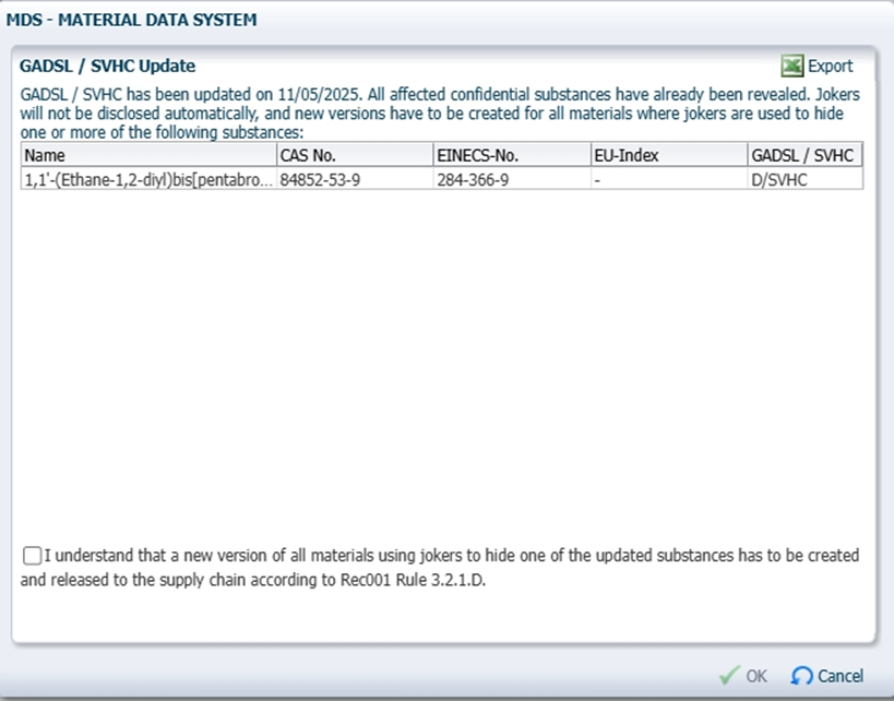 SVHC 변동 사항은 IMDS 시스템 물질 정보에 반영됩니다. Release 15.1 반영 사항에 따라, SVHC로 지정된 물질이 기밀물질로 설정되어 있는 경우에는 즉시 공개됩니다. 이에 즉시 공개 작업 완료 후 IMDS 접속 시 GADSL/SVHC 업데이트 관련 팝업이 발생되며, 확인 절차를 완료해야만 로그인이 가능합니다.