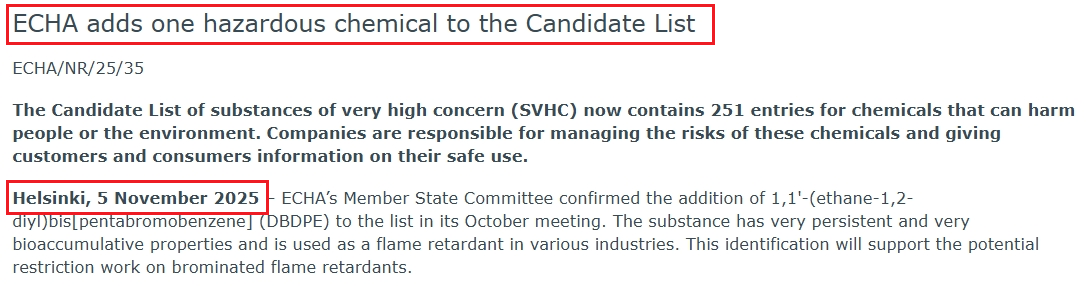 2025년 11월 5일, ECHA 회원국위원회는 DBDPE를 SVHC 후보물질목록에 추가하기로 확정하였습니다. 이에 따라 해당 목록의 총 항목 수는 250개에서 251개로 늘어났습니다.