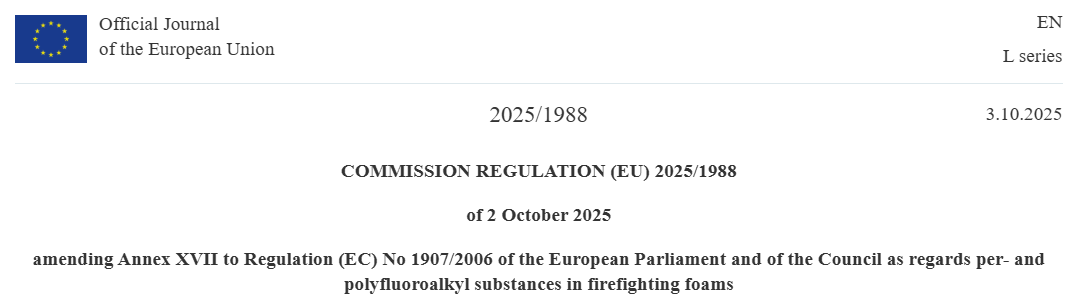 2025년 10월 3일, European Commission (EC, 유럽연합집행위원회)은 소방용 폼(Firefighting foam) 내 PFAS 물질 사용을 제한하는 위임 규정 (EU) 2025/1988을 공표하였습니다.